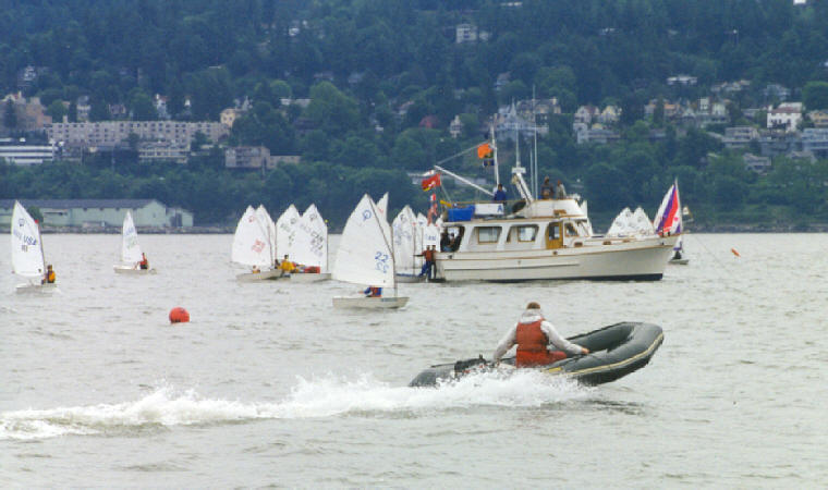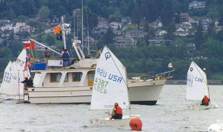 Serendipity is a favorite committee boat for junior sailors and race committees.Here we see her as the committee boat for the 1998 Junior Ski to Sea Regatta.A second picture appears below. Thanks to photographer Gordon Rogers.